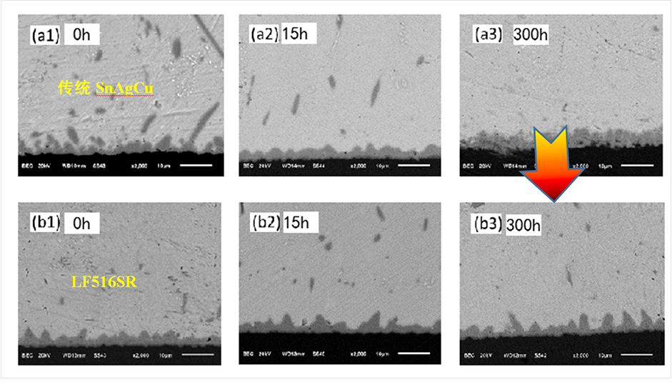 針對(duì)無(wú)鉛高可靠化發(fā)展趨勢(shì),尤其汽車電子、5G領(lǐng)域?qū)煽啃缘囊螅鶕?jù)Sn-Ag-Cu 合金的特性,進(jìn)行有針對(duì)性的合金及微合金的調(diào)整,改善了焊料的組織結(jié)構(gòu)和性能,推出 LF516SR系列電子用高可靠無(wú)鉛焊料,可為客戶提供多種高可靠互連解決方案。