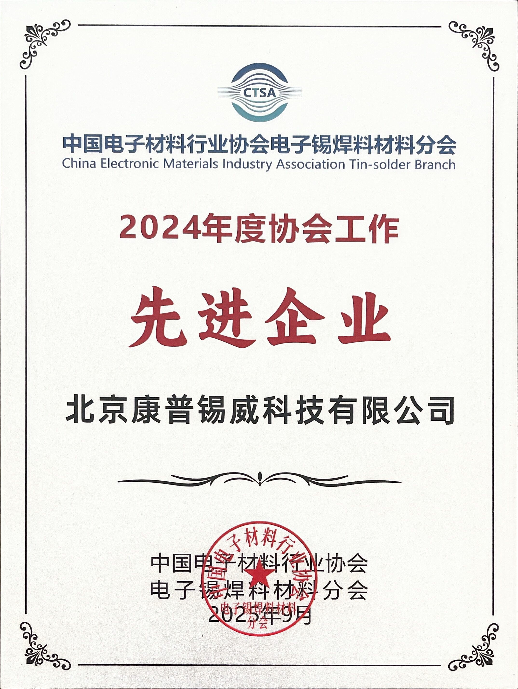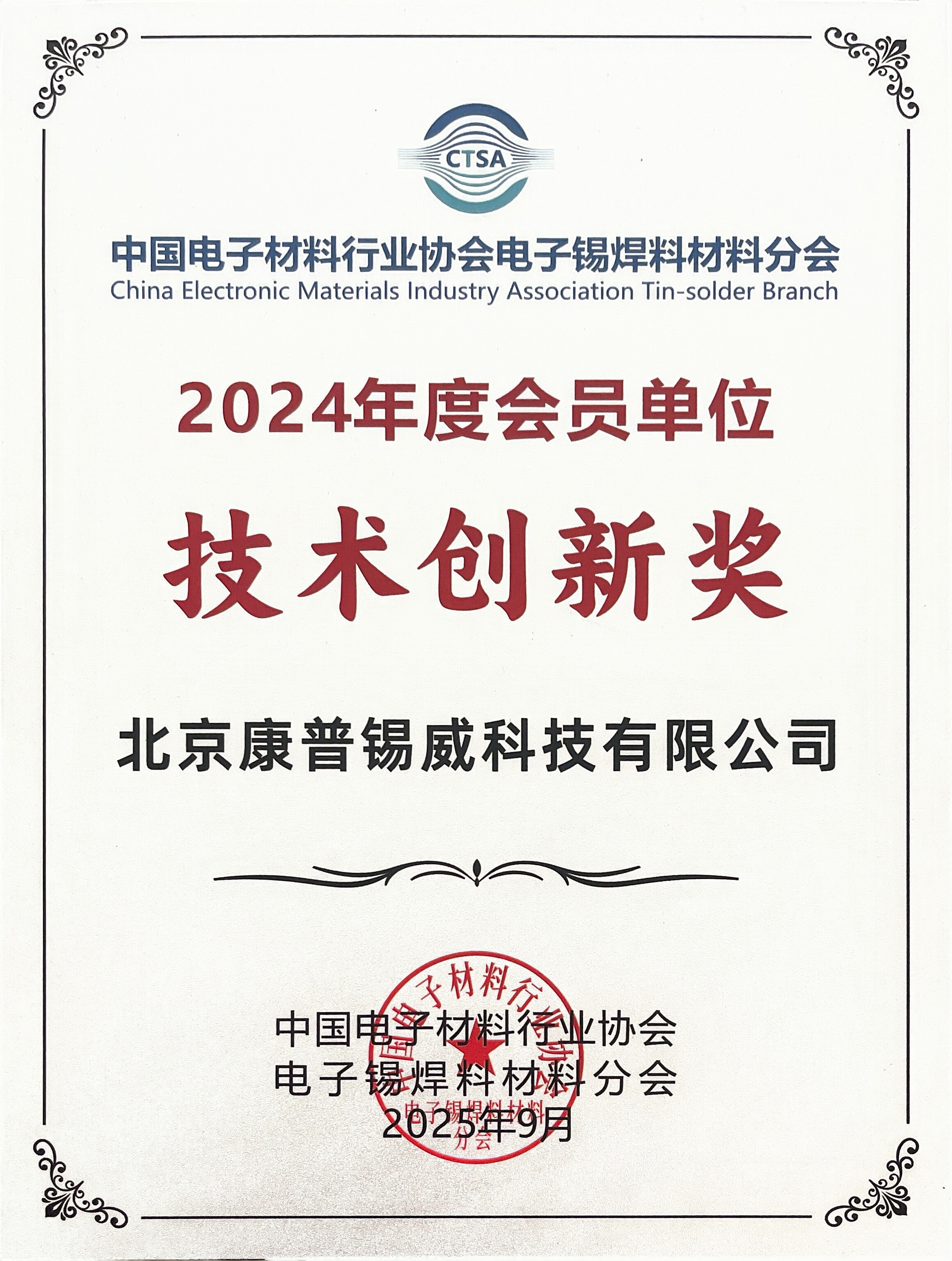 大會期間,為總結經驗、表彰先進、研判形勢、提振信心,推動新域新質發展,中國電子錫焊料材料分會圍繞行業排名、技術貢獻等方面開展了多項評比。康普錫威作為副理事長單位,榮獲2024年度“中國電子錫焊料行業綜合排序前二十企業”與“協會工作先進企業”稱號,副總經理劉希學代表公司接受授牌。同時,基于康普錫威在科技創新與行業引領方面的突出表現,公司還被授予“技術創新獎”。